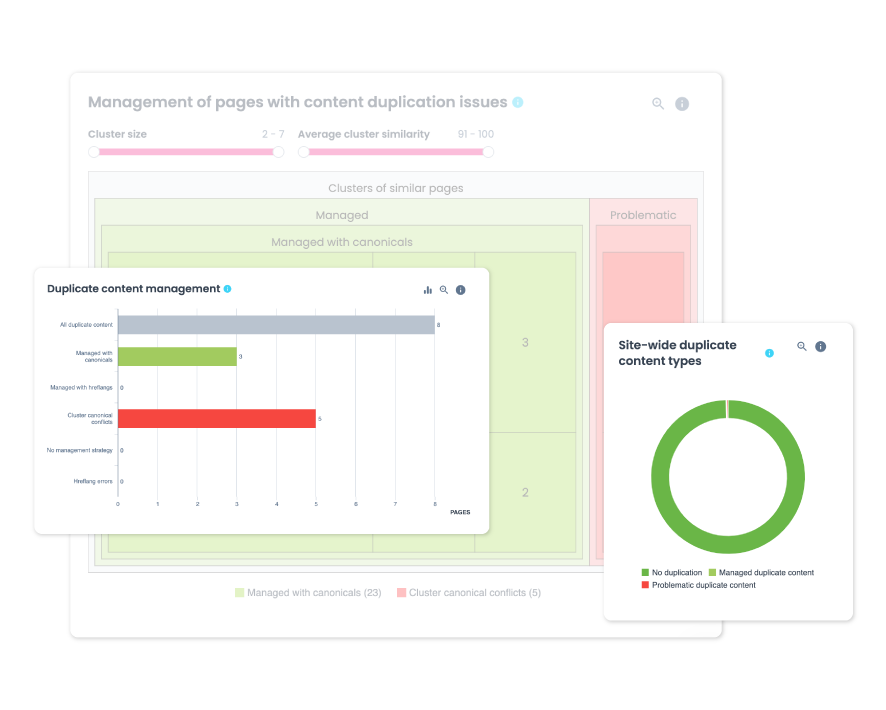 Discover how similar your pages are to one another, and whether or not your rankings in search engines are impacted. Prioritize improvements based on this knowledge, and be confident you’re spending your time and effort on changes that will move the needle.